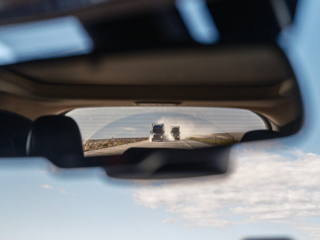 The huge trucks on the road seemed unimpressed from the rain and battled for supremacy: